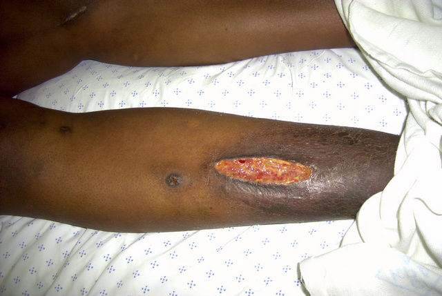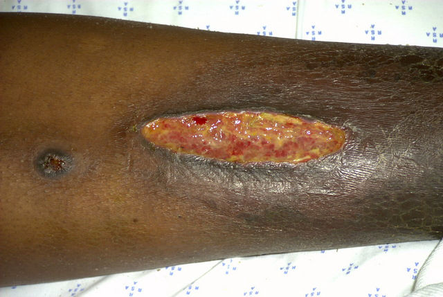 Necrotic collagen anchoring debris to the wound disintegrates and is absorbed by the Chemspunge wound dressing. (No cleaning of the wound is required, the wound is cleaned through osmotic pressure)