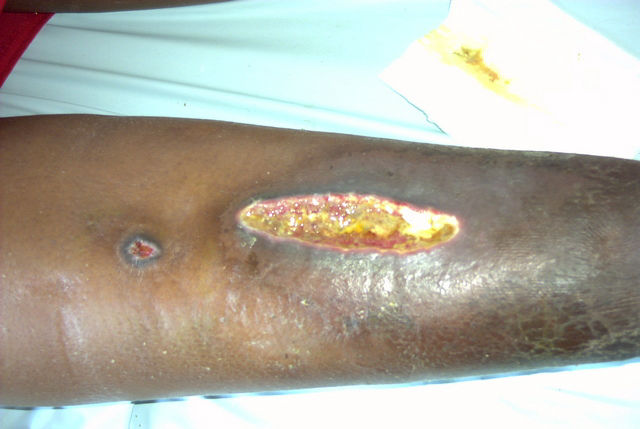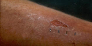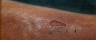 Necrotic collagen anchoring debris to the wound disintegrates and is absorbed by the Chemspunge wound dressing. (No cleaning of the wound is required, the wound is cleaned through osmotic pressure)