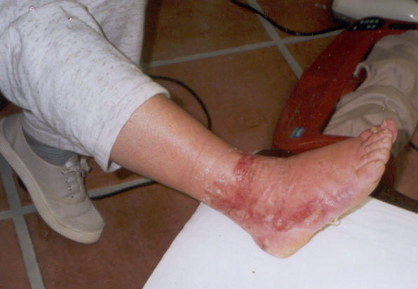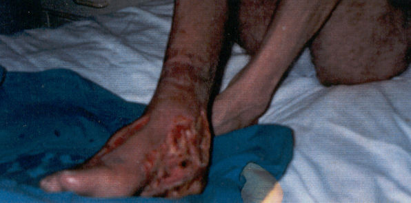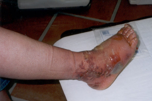 The blisters, surrounded by a bruise and red skin color, rupture as the venom spreads widely around the bite.